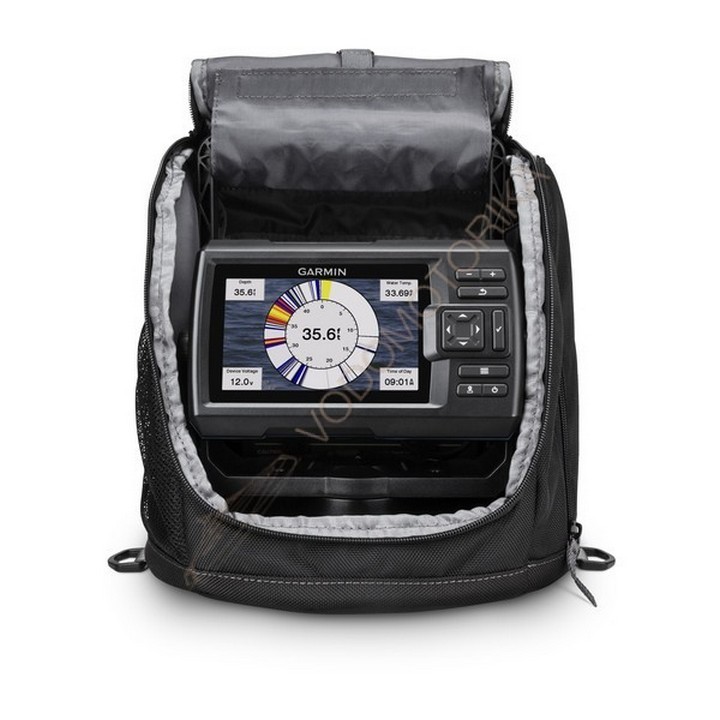 - Переносная сумка помогает удобно разместить эхолот, кабели и аккумулятор для дневной рыбалки на льду