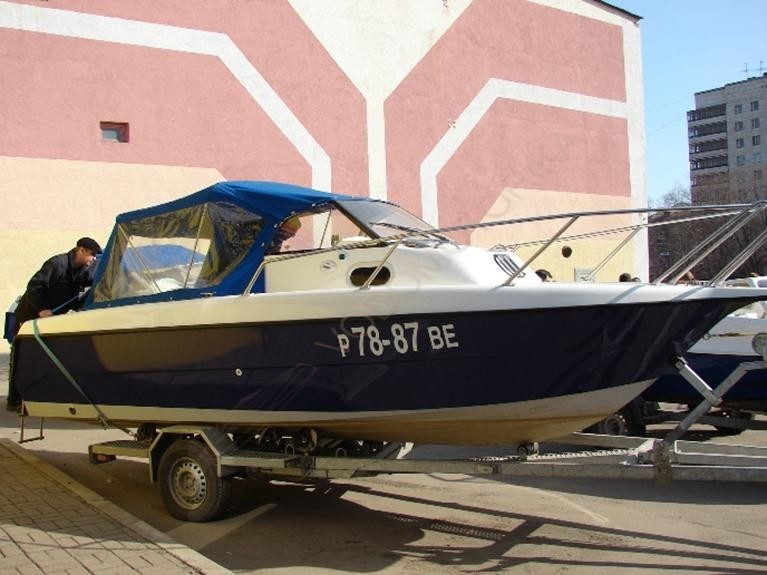 Моторный катер из стеклопластика с каютой.
