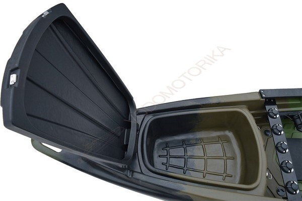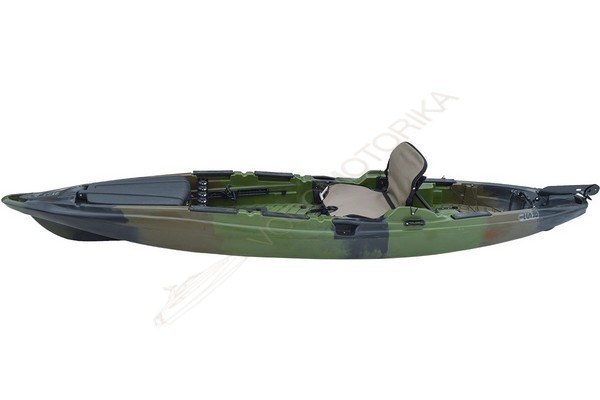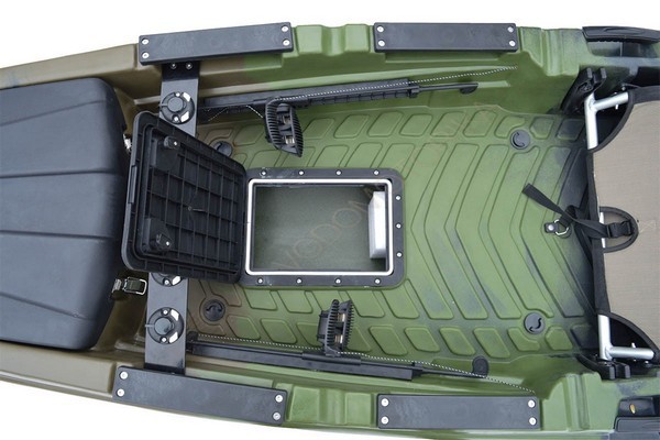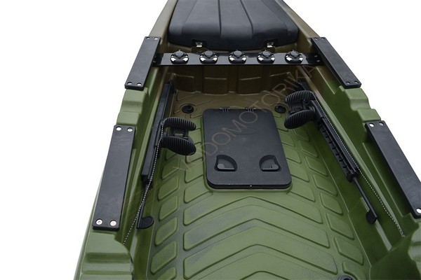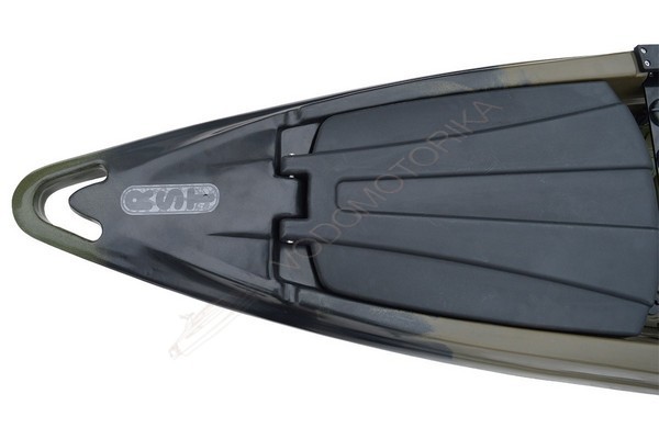 Для удобства управления рыболовный каяк «Мурена» комплектуется рулем и пяточными упорами. По бокам лодки расположены бандажные держатели весла с клипсами.