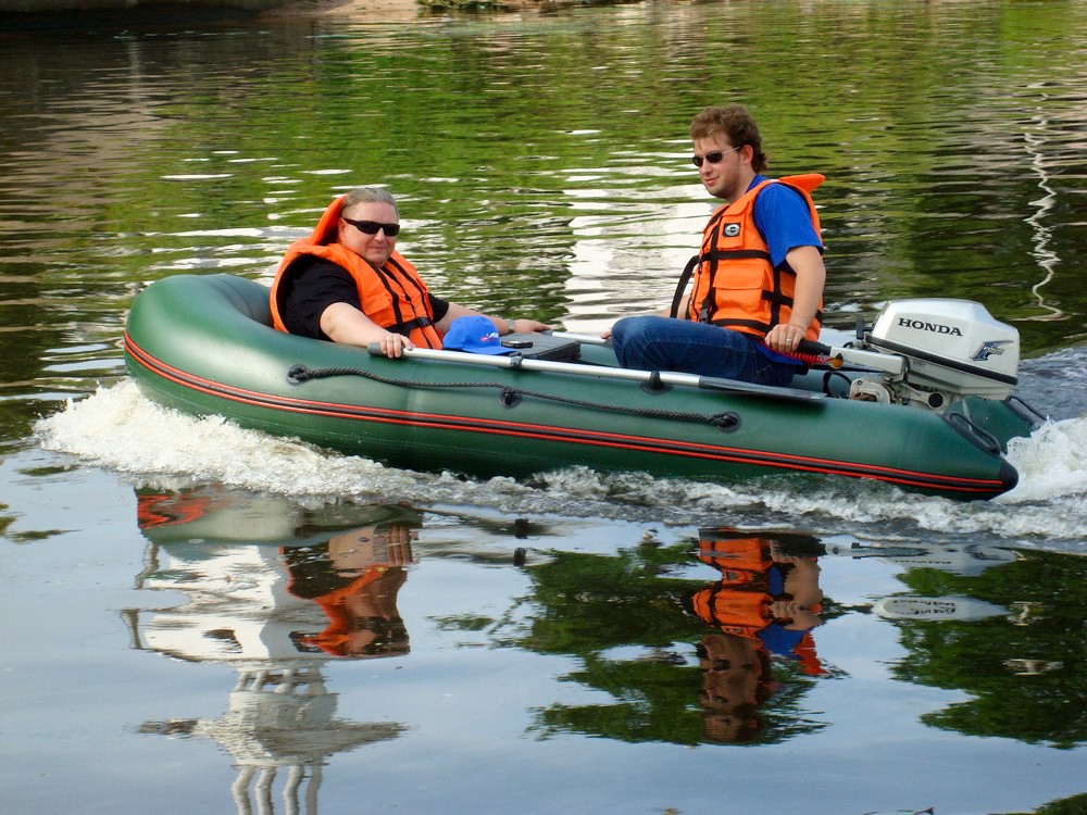 Лодка имеет транец из окрашенной водостойкой фанеры высотой 385 мм, который жестко приклеен к баллонам. В месте крепления двигателя предусмотрены накладки для уменьшения износа.