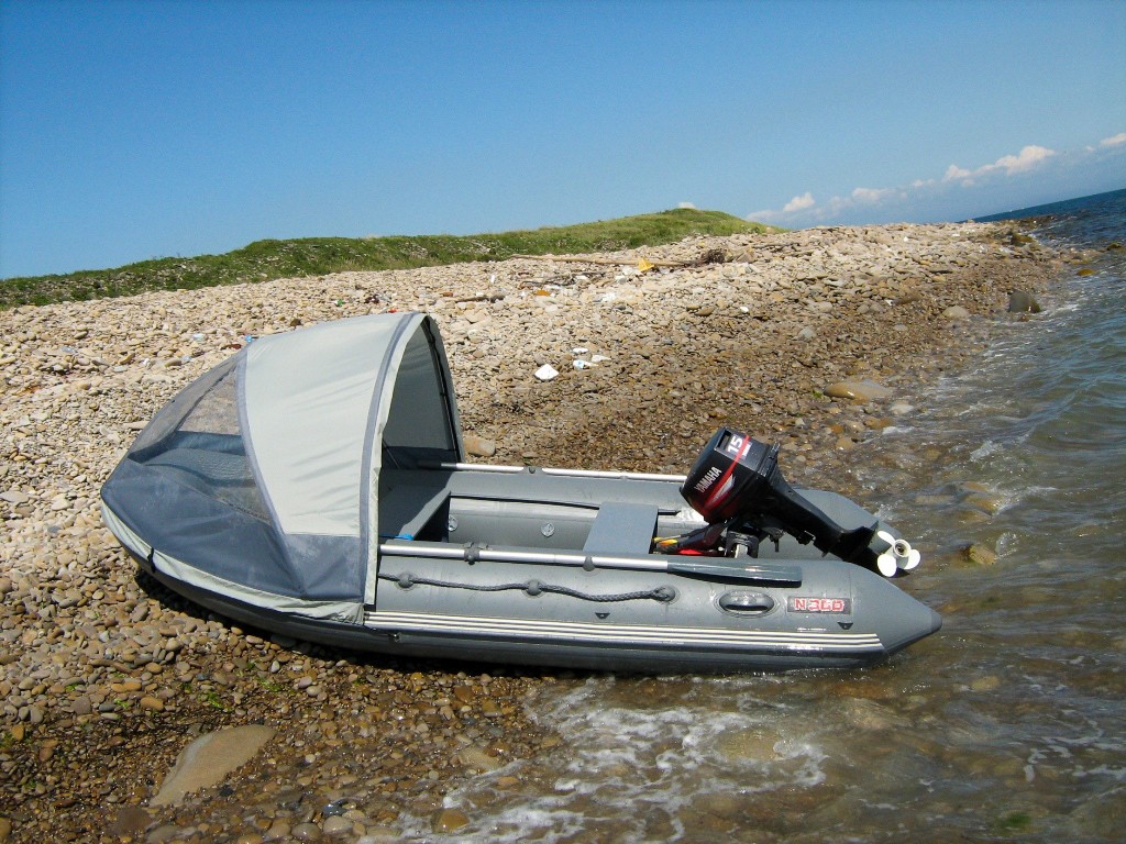 Лодка имеет транец из окрашенной водостойкой фанеры, который жестко приклеен к баллонам. В месте крепления двигателя предусмотрены накладки для уменьшения износа.