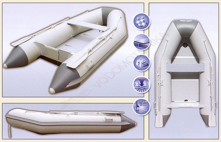 Надувная лодка выполнена из прочного материала, который способен выдержать различные воздействия (бензин, соленая вода, масло).