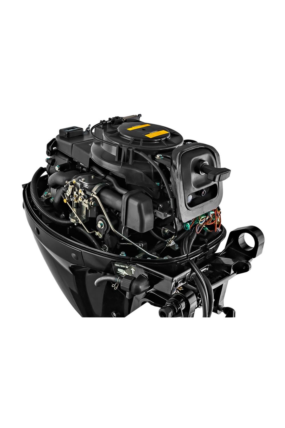 Подвесной мотор RRF9.9FES PRO развивает мощность 9.9 л.с. при объеме 362 см3. Количество цилиндров – 2, диаметр цилиндра 61 мм, ход поршня 59 мм. Максимальное число оборотов в минуту находится в пределах от 4500 до 5500. Двигатель имеет карбюраторную систему питания, система зажигания CDI. Охлаждается мотор водой. Выхлопные газы удаляются через винт.