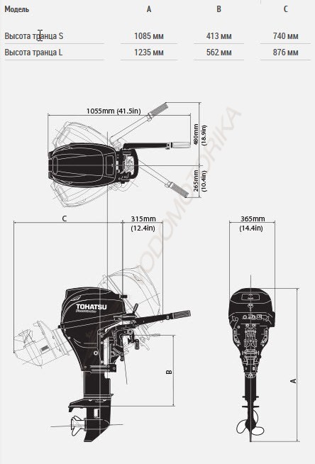 Подвесной лодочный мотор Tohatsu MFS20C EPS рассчитан под высоту транца 381 мм и имеет вес 46 кг.