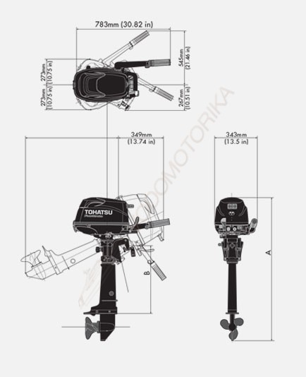 Подвесной лодочный мотор Tohatsu MFS5C S-L рассчитан под высоту транца 508 мм и имеет вес 27 кг.