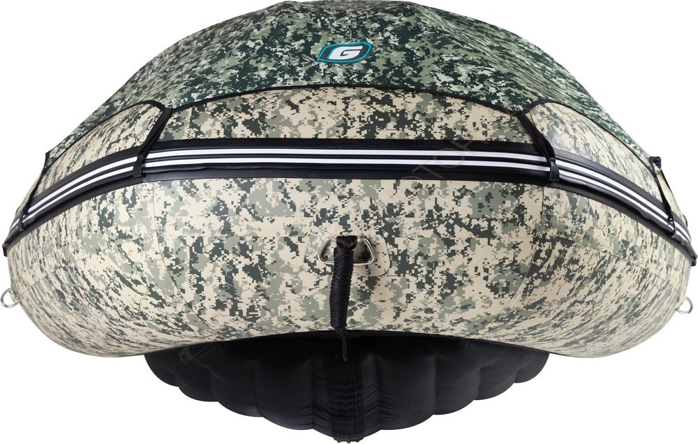 Баллоны лодки GLADIATOR E 450 CAMO изготовлены из пятислойного армированного ПВХ материала плотностью 1100 г/м2; страна производства – Южная Корея (плотность днища 1350 г/м2).
