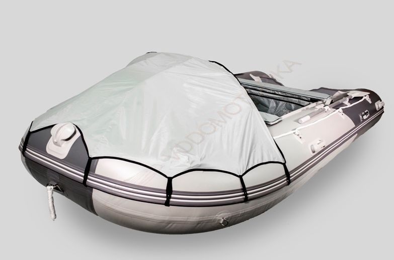 Тент с надувной дугой можно установить на носу лодки, под него помещается носовая сумка.