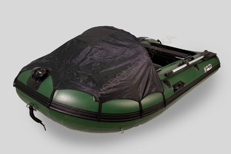 Тент с надувной дугой можно установить на носу лодки, под него помещается носовая сумка.