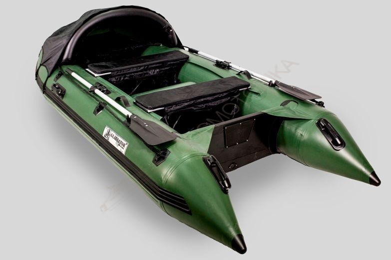 В комплект GLADIATOR D470 AL входят 1 мягкое (надувной баллон) и 2 жестких сиденья из водостойкой фанеры, местоположение которых можно регулировать замками трения вдоль направляющих на баллонах.