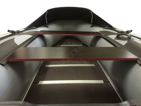 Лодка поставляется с пайолом из водостойкой ламинированной фанеры толщиной 9 мм. Пол состоит из 5-ти щитовых пайол, которые обрамлены в алюминиевый профиль и крепятся между собой по системе крепления «папа-мама» (шип — паз).