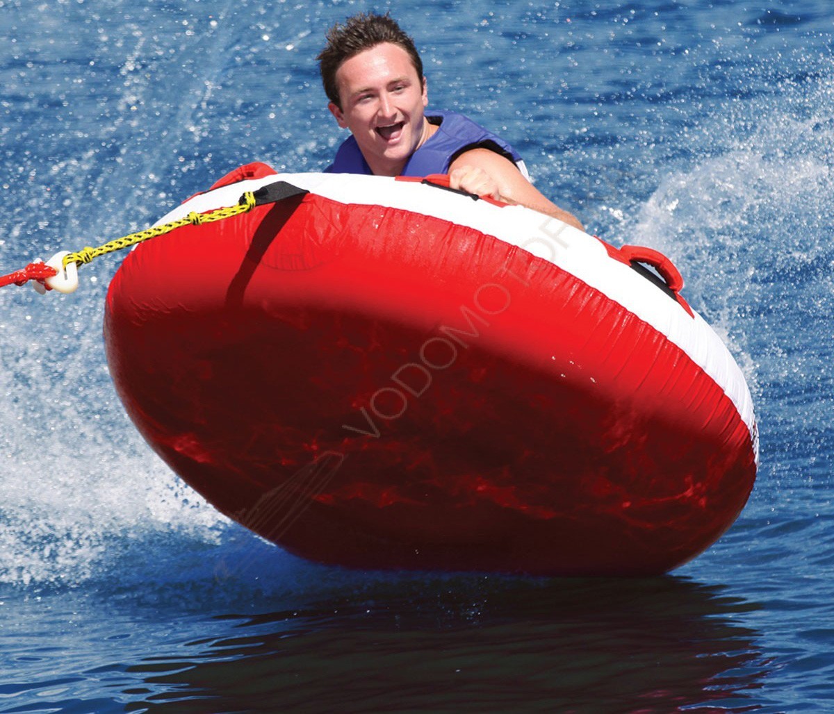 Надувная ватрушка - апробированный вариант для экстремалов - одиночек. Имеет наряду с диаметром порядка 145 см (57") тонкий профиль, обеспечивающий возможность выполнять эффектные прыжки на воде. Модель из серии "Оцени сам насколько ты крут!". Дополнительно снабжена 4-мя прочными ручками, нейлоновым чехлом 840 denier.