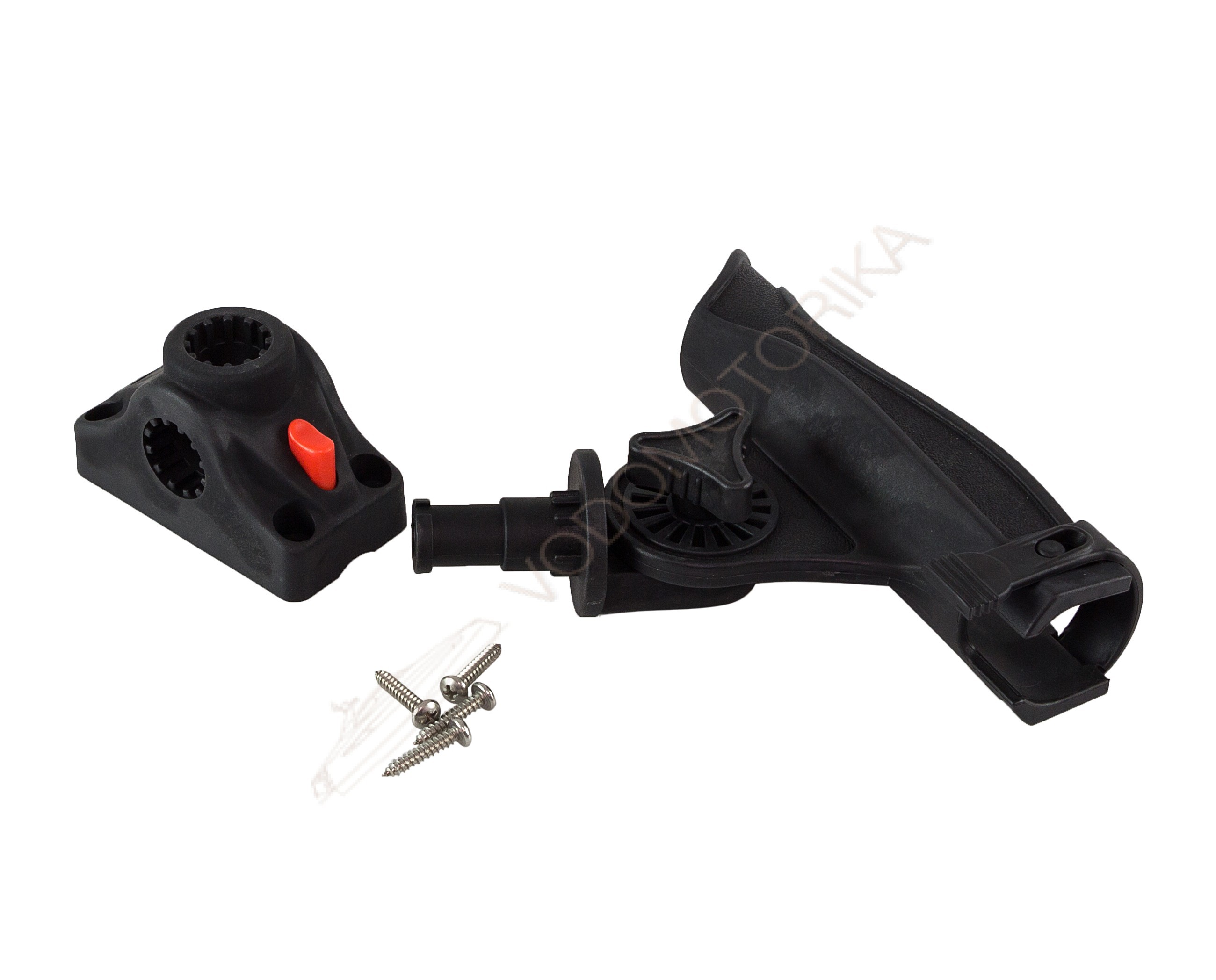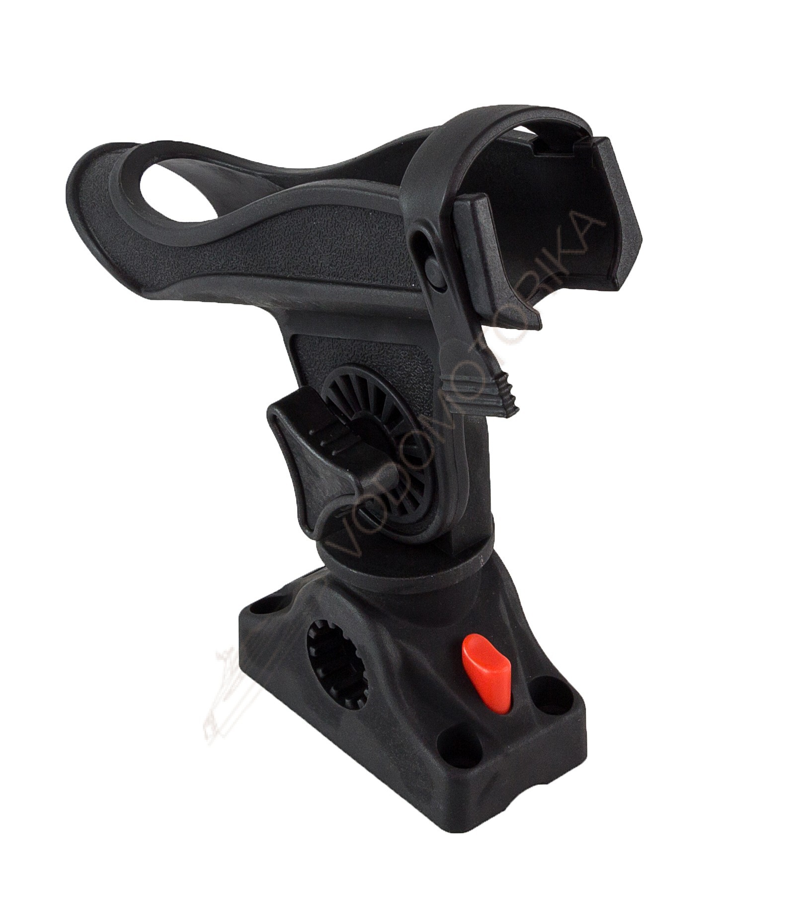 Подставка под удочку с ремешком-фиксатором позволяющим закрепить спиннинг на время движения судна .Конструкция держателя позволяет настроить угол наклона и направление удочки. Подставка и держатель изготовлены из прочного пластика.