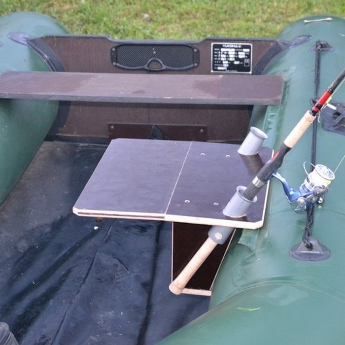 Удобный столик трансформер в лодку ПВХ с полочкой под аккумулятор и держателем спиннинга.