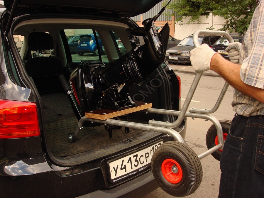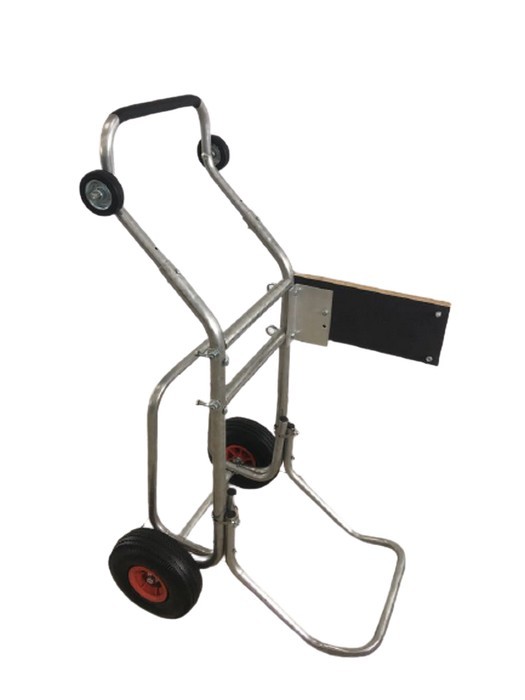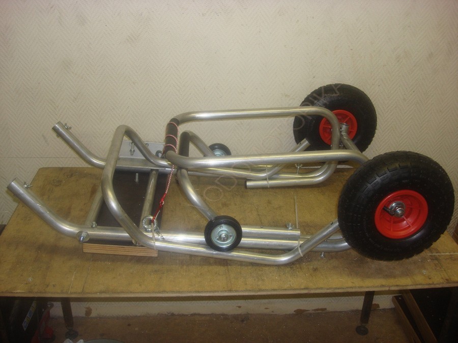 - Багажник — для установки стандартной для лодочного мотора топливной емкости на 25 л или пластиковой канистры на 20 л. Опционально можно увеличить ширину багажника. Багажник свободно откидывается (необходимо поднять крепежные хомуты из нержавеющей стали) и позволяет удобно снимать топливную емкость при закрепленном на тележке лодочном моторе. Ручка багажника отделана пластиком. При транспортировке в автомобиле багажник удерживает топливную емкость в горизонтальном положении, троссик на карабинах страхует от перемещения емкости вперед и назад при торможении или ускорении автомобиля;- Пневматические шины 250 мм (рекомендованное давление 1 атм.) на 2-х подшипниках закреплены самоконтрящимися оцинкованными гайками на оси шпильки диаметром 10 мм (или в усиленном варианте — 16 мм) с расчетным люфтом для движения по каменистому грунту или по колее.