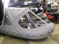 Тент-трансформер предназначен для защиты пассажиров от брызг, дождя, ветра, насекомых во время движения, а также для защиты пассажиров и вещей во время стоянки на берегу и на воде.