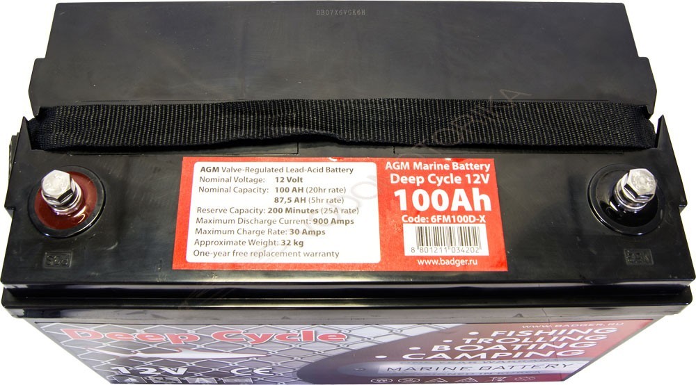 Тяговый AGM аккумулятор 100Ah для «больших» транцевых и баковых (носовых) электромоторов с тягой 54 фунта на швартовых.