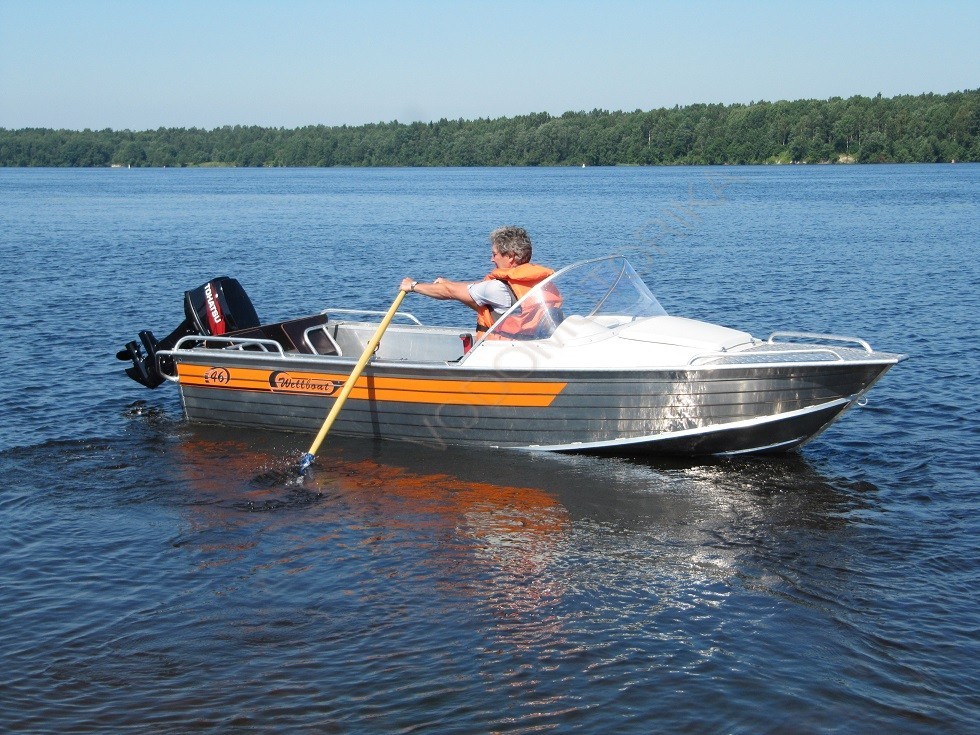 Алюминиевая лодка Wellboat 46 имеет длину 4.65 м при ширине 1.50 м.