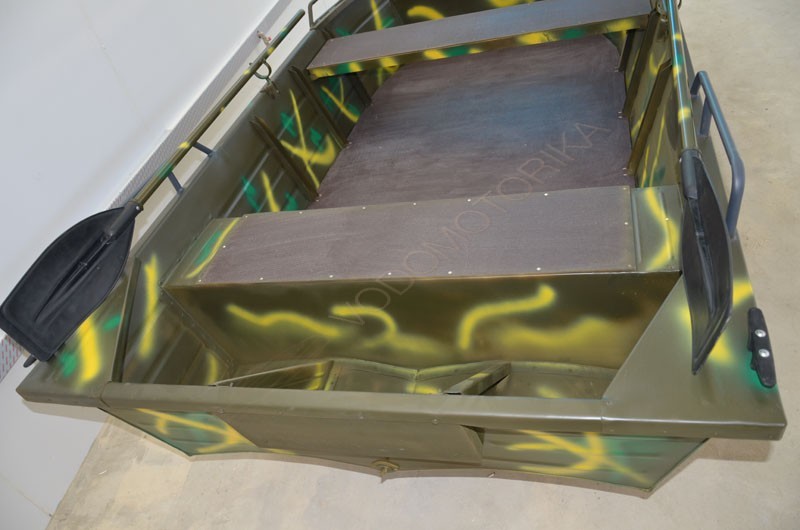 Корпус плоскодонных лодок «Охотник» — это сочетание арочных(тримаранных) обводов днища, высокого борта и крепкого транца под навесной мотор.