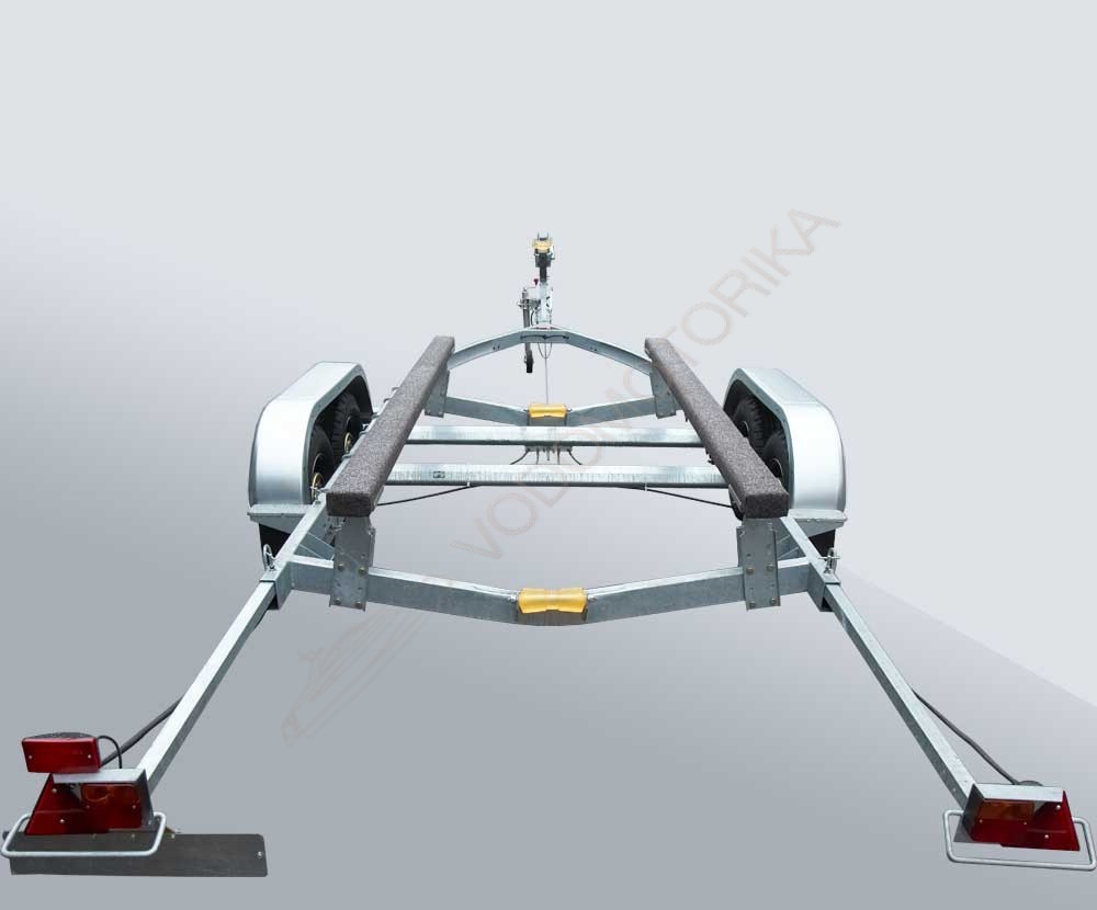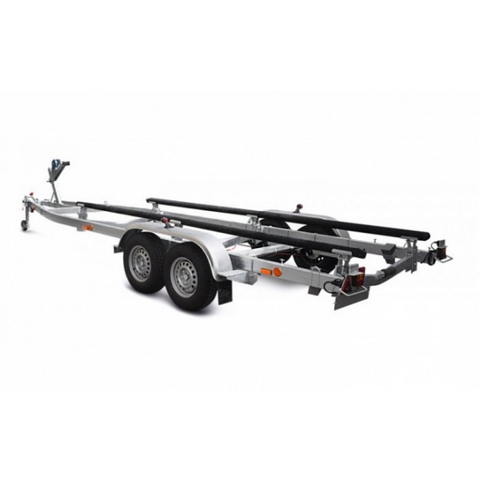Двухосный легковой прицеп, предназначенный для перевозки лодки, катера или яхты. Прицеп оснащен тормозом наката и выдвижными штангами с габаритными фонарями. Резино-жгутовая подвеска. Специальные ложементы предотвращают повреждения корпуса перевозимой техники. Ложементы, поддерживающие груз, и носовой упор регулируемые.