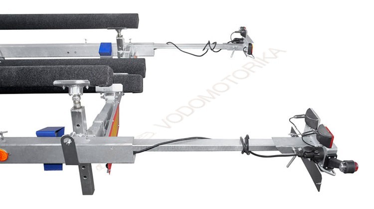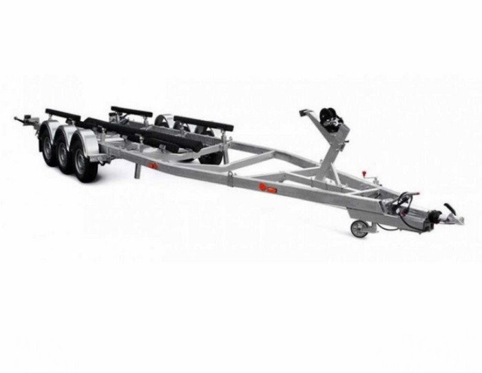 Трехосный легковой автоприцеп, предназначенный для перевозки лодки, катера или яхты. Прицеп оснащен тормозом наката и выдвижными штангами с габаритными фонарями. Резино-жгутовая подвеска. Специальные ложементы предотвращают повреждения корпуса перевозимой техники. Ложементы, поддерживающие груз, и носовой упор регулируемые.