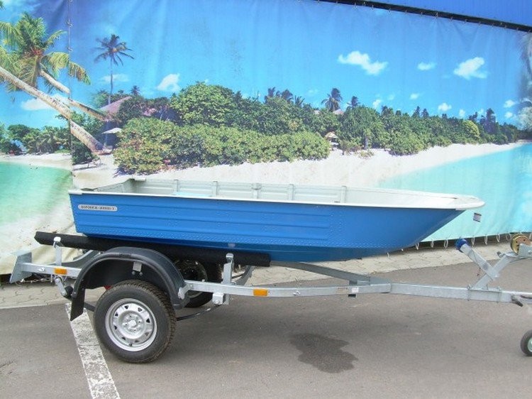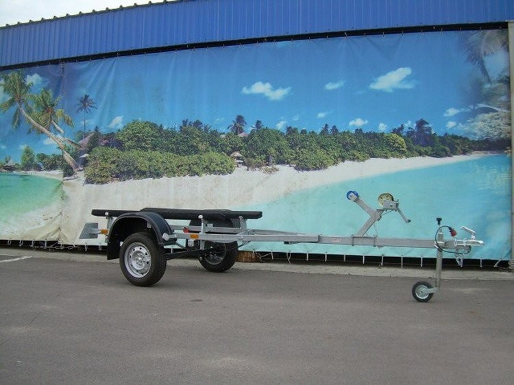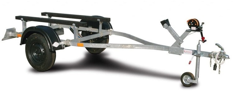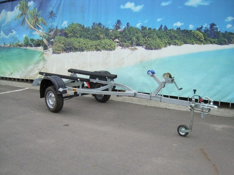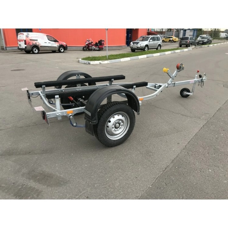 Одноосный оцинкованный прицеп марки «Трейлер» для перевозки лодок ПВХ или гидроциклов длиной до 3.9 м. Качественная рессорная подвеска с амортизаторами обеспечивает плавность хода прицепа при любой степени загрузки. Опорами выступают ложементы, обитые ковролином для предотвращения повреждений корпуса водной техники и поддающиеся регулировке под обводы судов. Фиксация гидроциклов и лодок производится с помощью рым-болтов на платформе.