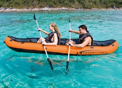 Двухместная надувная байдарка Bestway ( 65052N ) с размерами 330 х 94 см имеет 2 съёмных боковых камеры и надувной пол, изготовленные из прочного армированного ПВХ.