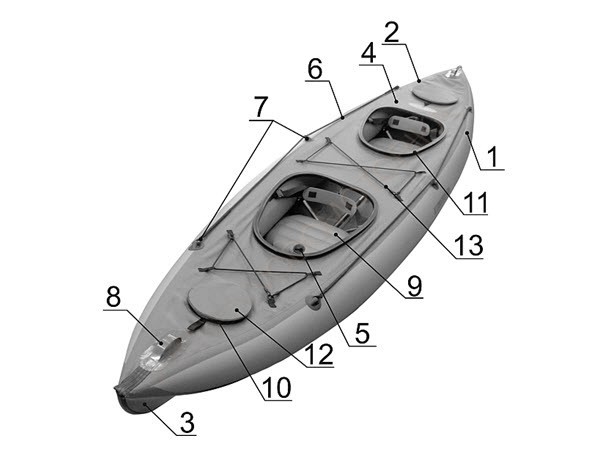 На деке лодки в носу и корме предусмотрены грузовые люки, для удобства сборки (разборки) байдарки, а также при загрузке (разгрузке), кроме этого на деке имеется профиль для крепления фартука и резинки-крепления, используемые, для крепления багажа.