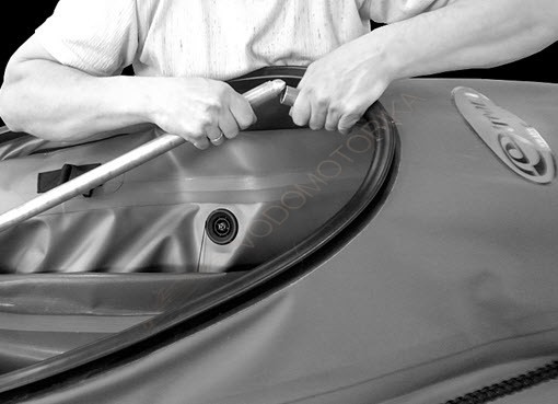На баллонах, а так же подушке-сидении расположены воздушные клапана, при помощи которых, байдарка надувается (сдувается).