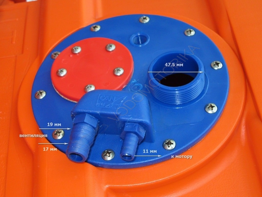 На крышке лючка расположены переходники "елочка" для присоединения топливного шланга и штуцера вентиляционного патрубка, заливная горловина, стандартное крепление для монтажа датчика уровня, отверстие со стандартной резьбой 1/4 NPT для установки штуцера обратного слива топлива. Крышка заливной горловины оборудована сапуном.
