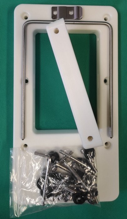 Изделие состоит из двух частей, соединяемых металлической скобой, "нижняя" часть крепиться к палубе лодки, а "верхняя" к электромотору или другому оборудованию, что позволяет его при желании быстро снять или установить. Кронштейн может быть закреплен навесным замком для защиты от кражи.