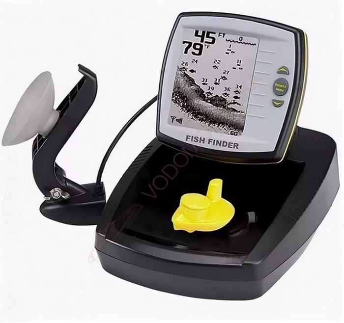 На небольших речках его можно использовать при поиске рыбы не только по глубине, но и по ширине речки. Достаточно сделать нехитрое приспособление для крепления датчика и, опустив его под лед, направить не вниз, а в сторону. Ведь максимальная дальность работы прибора 73 метра, и шкала расстояния до рыбы поможет вам окончательно определить, где прячется ваш улов.