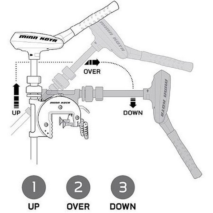 Революционная модель электромотора Minn Kota Traxxis с абсолютно новым усовершенствованным транцевым креплением, которое позволяет одной рукой поднять мотор из воды.