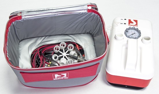 В транспортировочной сумке вместе с насосом находятся: гибкий шланг с набором переходников, подходящих практически ко всем современным клапанам, зарядное устройство 220 В, провод для зарядки от прикуривателя автомобиля и дополнительные провода с крокодилам для подключения внешнего аккумулятора.