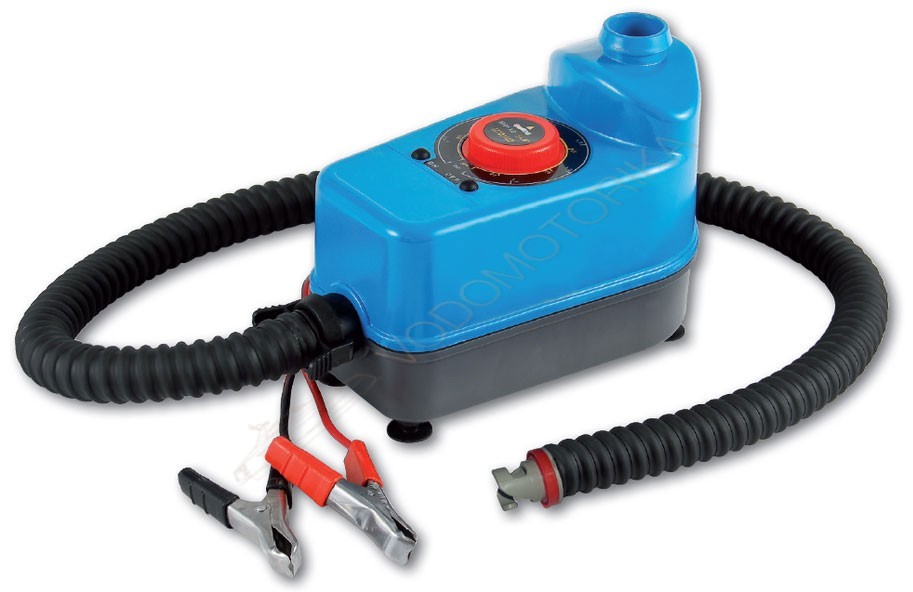 Электрический насос высокого давления с питанием от источника тока напряжением 12 В. Максимальное давление: 1,5 Бар, производительность: 160 л/мин. Укомплектован сумкой для переноски и воздушным шлангом длиной 105 см, с байонетным разъемом под воздушный клапан Браво 2005. Насос обладает функцией откачивания воздуха из баллона.