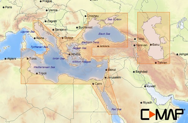 Полное покрытие карты: Восточная часть Средиземного моря, Черное и Каспийское моря: Греция (частичное покрытие), юго-запад Турции, Сирия, Ливан, Израиль, Египет (включая Суэцкий канал и залив Акаба), Ливия и Саудовская Аравия. Покрытие Красного моря заканчивается к югу от Джидды (Саудовская Аравия). Полное покрытие Черного моря, Азовского моря, Мраморного моря и Каспийского моря. Включает (частично) страны: Украина, Румыния, Болгария, Турция, Грузия, Россия, Казахстан, Туркмения, Иран и Азербайджан.