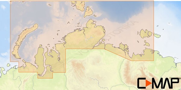 Навигационная карта C-MAP MAX-N+ WIDE RS-Y203 содержит информацию о регионе Северное побережье России: от Новой Земли до пр. Лаптева, о. Котельный.