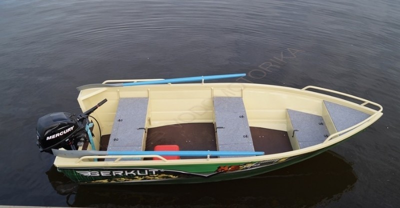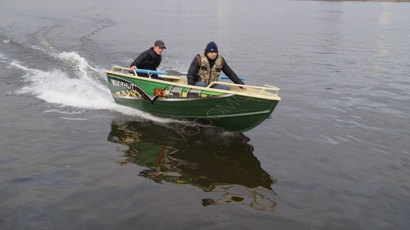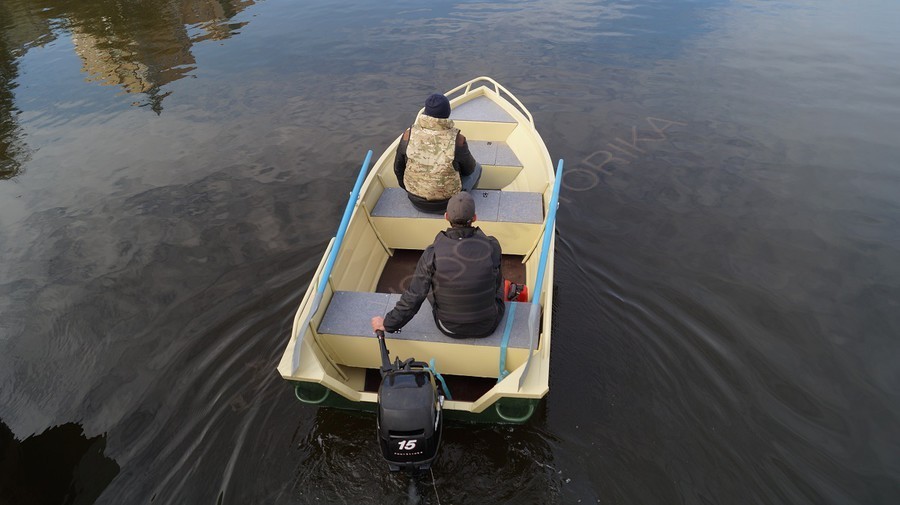 Алюминиевая лодка поставляется в зеленом цвете с бежевым кокпитом.