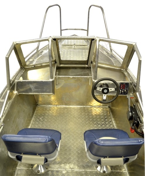 Пассажиры защищены от ветра и брызг носовым стеклом в сварной раме.