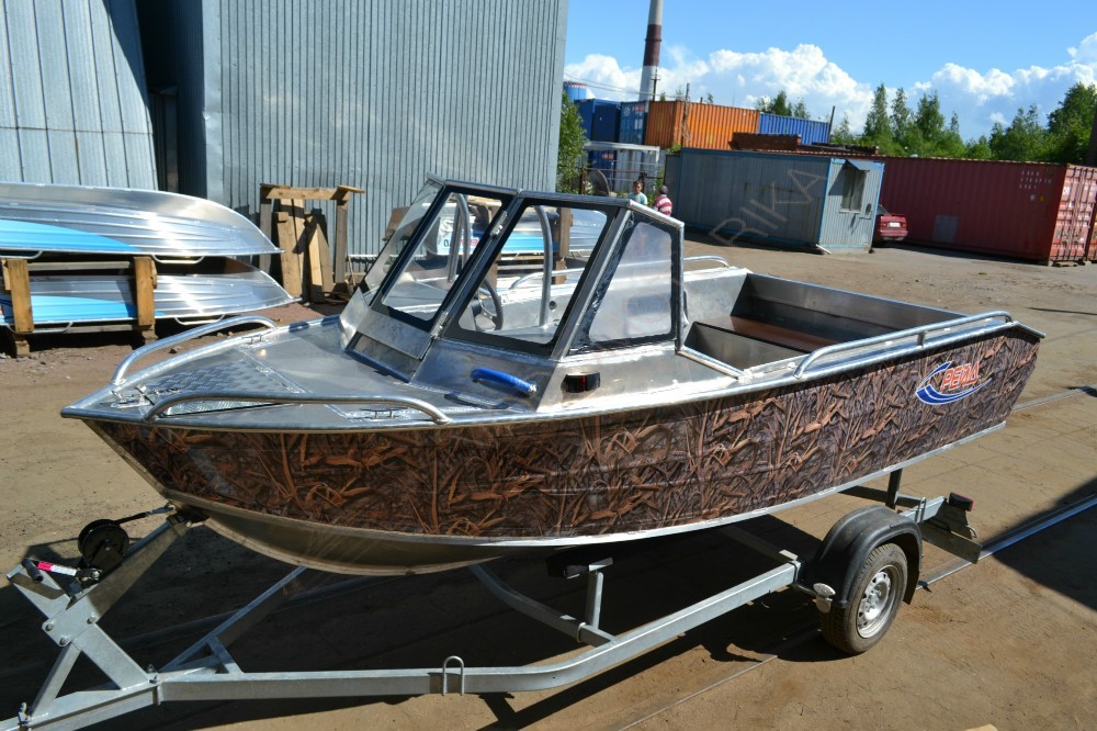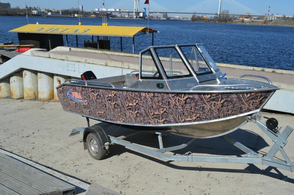 Алюминиевая лодка поставляется с частичной окраской (декоративные полосы и логотипы).