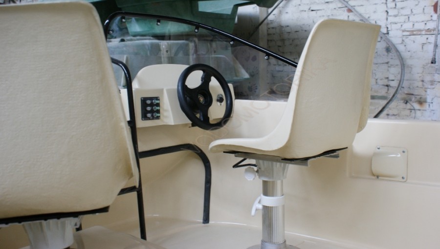 В комплект ОнегоКомпозит СКК Sorsa-440 входит стеклопластиковая лавка на корме, которая является частью корпуса, и 2 кресла перед панелью управления.