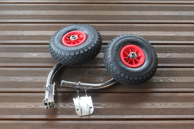 Площадка крепящаяся на транец лодки изготовлена из стали толщиной 3мм. Для изготовления кронштейна транцевого колеса используется труба, имеющая диаметр 32 мм и со стенками 2 мм. Конструкция кронштейна позволяет быстро устанавливать, снимать или изменять положение колес из рабочего в походное, либо наоборот. Во время движения по воде транцевые колеса поднимаются в походное положения и не мешают ходу лодки.