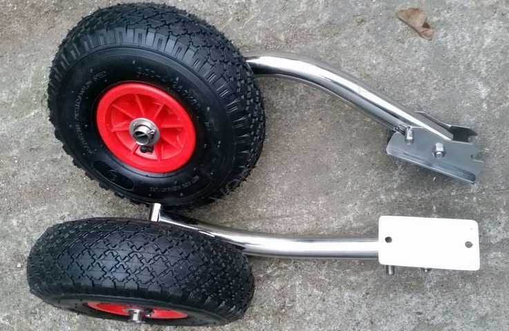 Площадка крепящаяся на транец лодки изготовлена из стали толщиной 3мм. Для изготовления кронштейна транцевого колеса используется труба, имеющая диаметр 32 мм и со стенками 2 мм. Конструкция кронштейна позволяет быстро устанавливать, снимать или изменять положение колес из рабочего в походное, либо наоборот. Во время движения по воде транцевые колеса поднимаются в походное положения и не мешают ходу лодки.