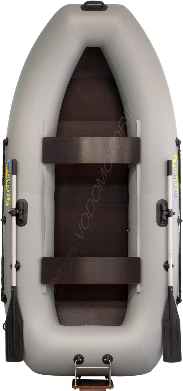 На левом борту имеется рым-кольцо. Весла изготовлены из алюминия и имеют разборную конструкцию.