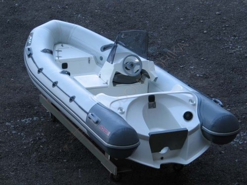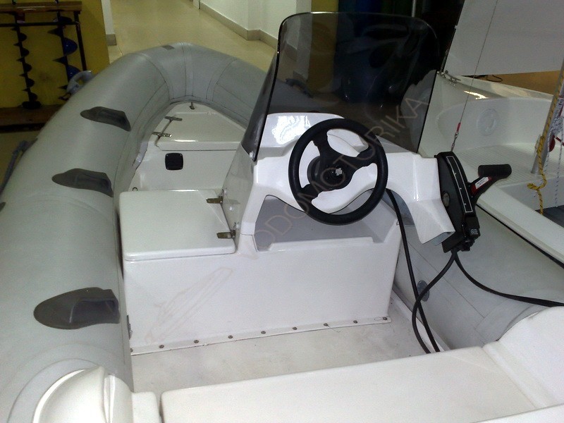 Надувная лодка имеет транец из стеклопластика, составляющий одно целое с жестким корпусом.