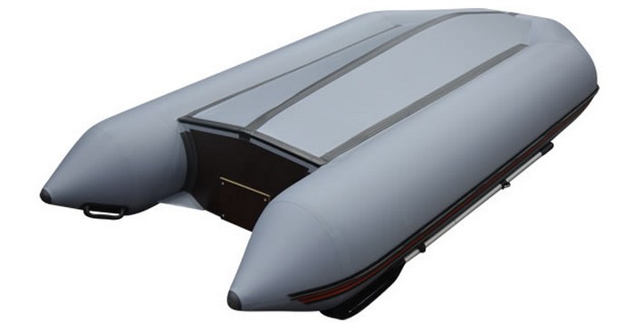 Надувная лодка имеет стационарный транец, жестко приклеенный к баллонам. В месте крепления двигателя установлены дополнительные накладки для уменьшения износа.