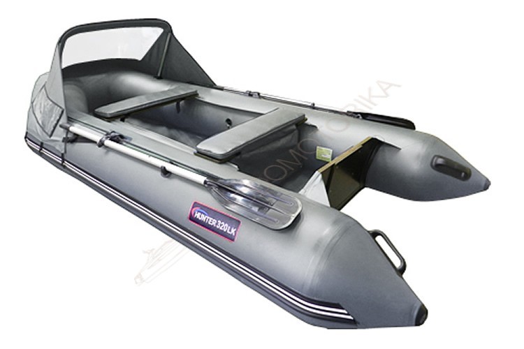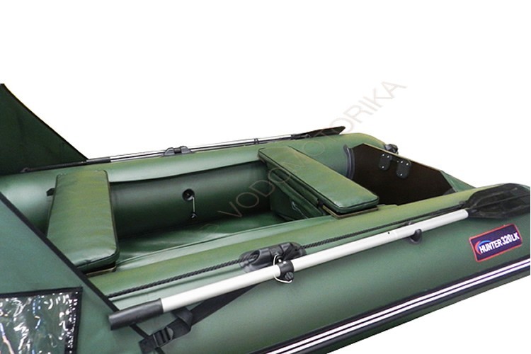 Безопасность пассажиров Хантер 320 ЛК Комфорт дополнительно обеспечивается натянутым вдоль борта леерным тросом. Разборные весла имеют длину 1,6 м. На носу и корме установлены ручки для удобства переноски. Для фиксации весел в стояночном положении имеются держатели. Между транцем и баллонами установлены брызгозащитные косынки (комингсы). Днище в уязвимых местах усилено дополнительным ПВХ профилем.