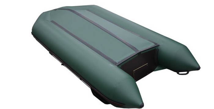 Надувная лодка имеет стационарный транец, жестко приклеенный к баллонам. Материал – ламинированная водостойкая фанера, толщина – 18 мм, высота – 395 мм. В месте крепления двигателя установлены дополнительные накладки для уменьшения износа.