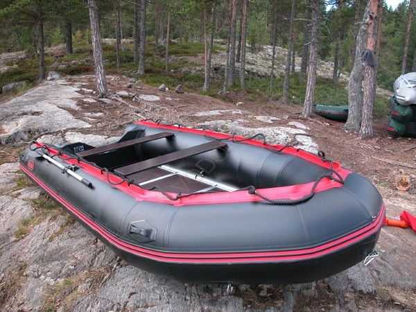 Лодка имеет транец из окрашенной водостойкой фанеры повышенной прочности, который жестко приклеен к баллонам.