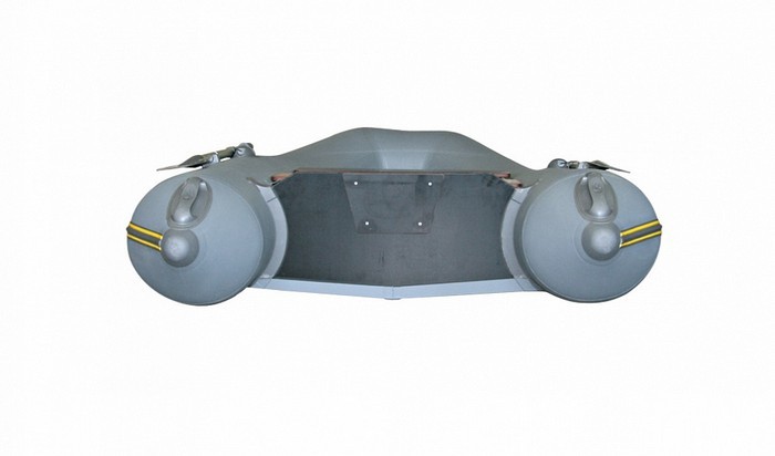 Лодка имеет транец из окрашенной водостойкой фанеры высотой 385 мм, который жестко приклеен к баллонам. В месте крепления двигателя предусмотрены накладки для уменьшения износа.