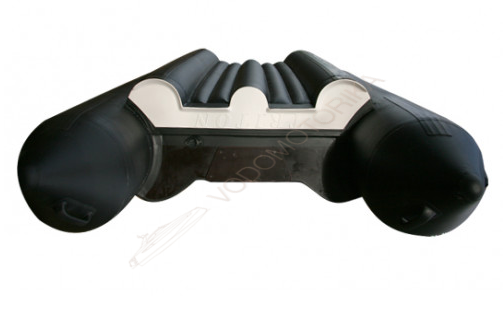Надувная лодка имеет стационарный транец из водостойкой фанеры. Нижняя часть транца имеет тримаранную форму и изготовлена из пластика.
